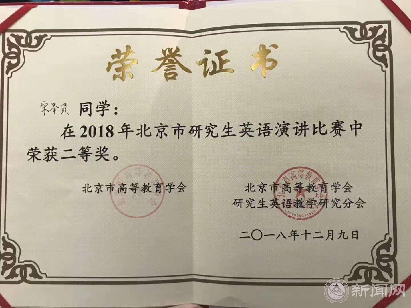 在近日举行的2018年北京市研究生英语演讲比赛中,永利官网2018级研究生Ba2班宋举贤同学经过初赛、复赛的激烈选拔,以优异成绩成功晋级決赛,与来自北京大学、清华大学、北京师范大学、中国科学院大学等十余所高校的优秀选手角逐,最终获得北京市研究生英语演讲比赛二等奖。