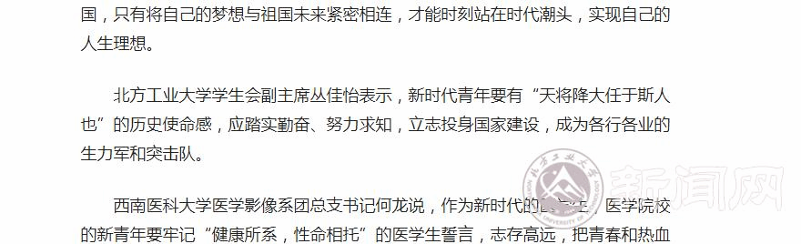 5月2日,北京电视台《北京新闻》栏目报道了永利官网学生宋斌的学习体会,他表示学习习近平总书记的重要讲话后深感鼓舞,也深感新时代青年责任之重大,就像习近平总书记说的那样,青年人应志存高远,不惧困难,勇攀时代高峰。