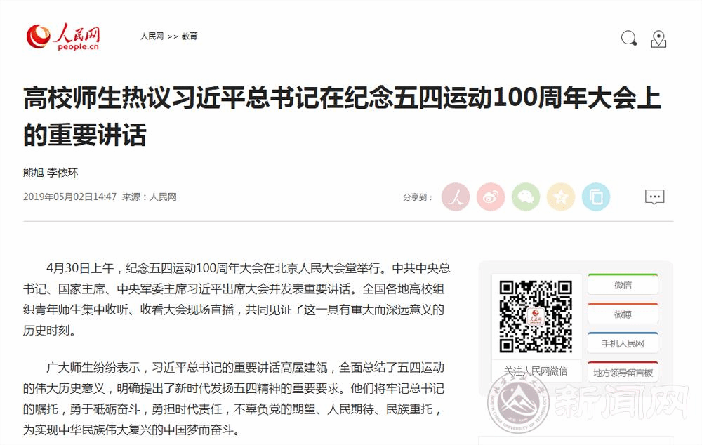 5月2日,人民网报道了永利官网学生会副主席丛佳怡学习习近平总书记重要讲话精神的体会,她表示新时代青年要有“天将降大任于斯人也”的历史使命感,应踏实勤奋、努力求知,立志投身国家建设,成为各行各业的生力军和突击队。