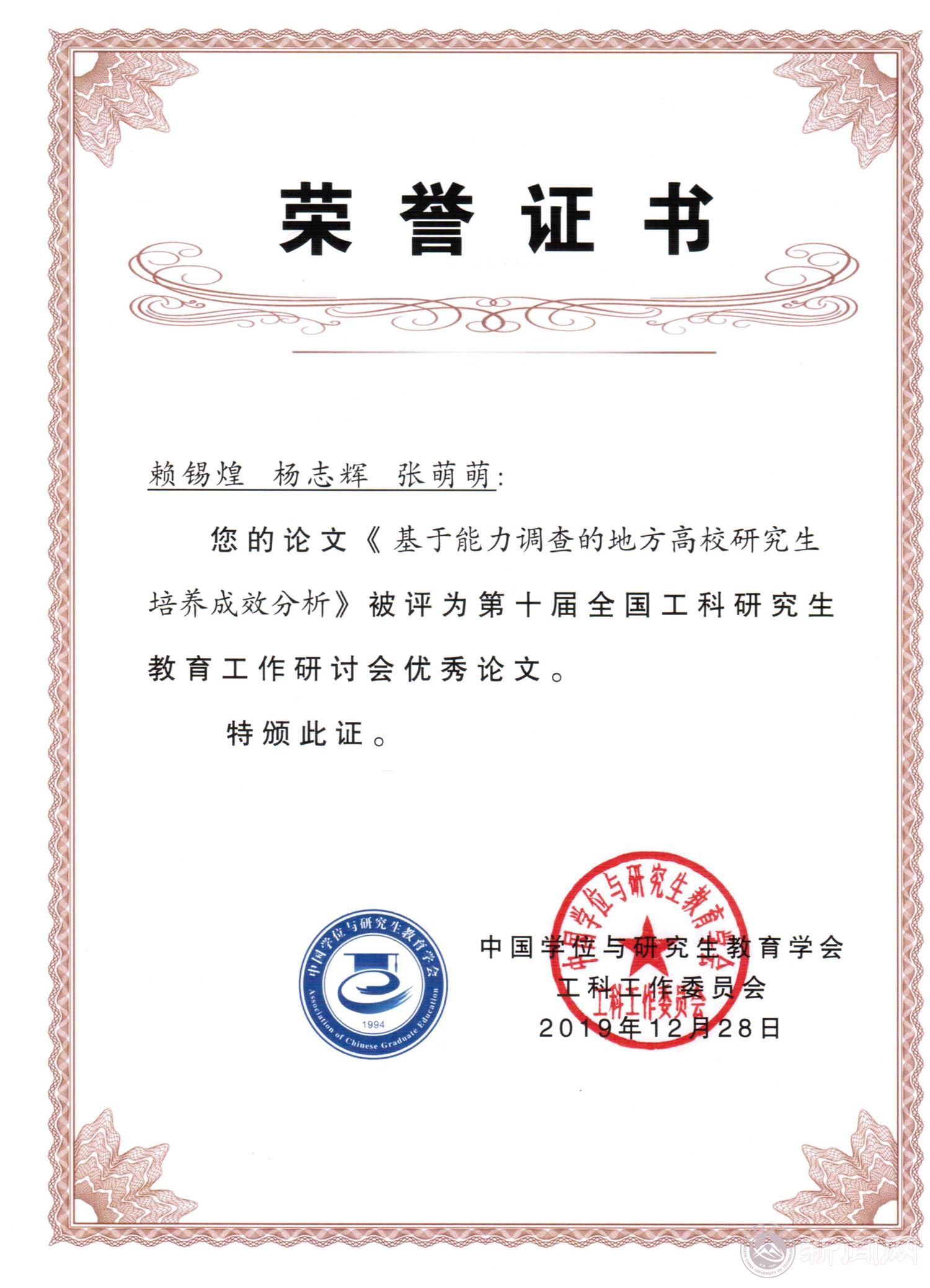 近日,2019年第十届全国工科研究生教育工作研讨会在昆明理工大学举办,来自全国192所高校的1000余名代表参加了会议。永利官网研究生院教师赖锡煌、杨志辉、张萌萌撰写的 “基于能力调查的地方高校研究生培养成效分析”获得“优秀论文”奖。本次会议共录用来自国防科技大学、复旦大学、同济大学、山东大学、哈尔滨工业大学等全国高校投稿的论文86篇,经过专家委员会严格评审,从中遴选出9篇优秀论文,永利官网是唯一获奖并应邀在会议上介绍成果的地方院校。