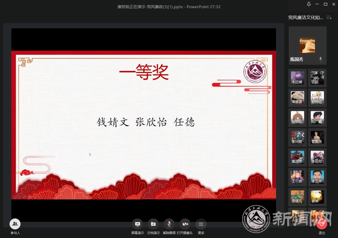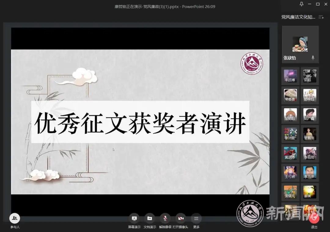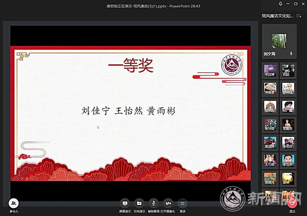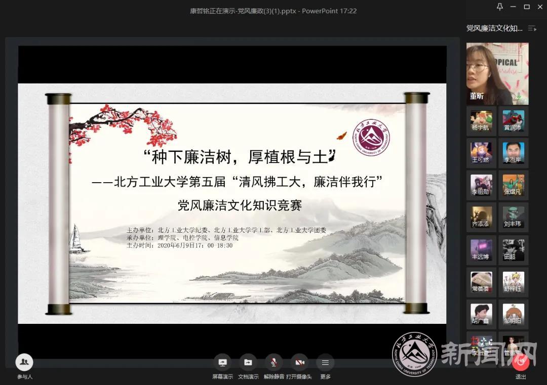 6月9日下午,由校纪委、校学工部、校团委主办,信息学院党委、电气与控制工程学院党委、理学院党委联合承办的“种下廉洁树,厚植根与土”——304永利集团官网入口第五届“清风拂工大,廉洁伴我行”党风廉政文化知识竞赛暨在线颁奖仪式隆重举行。校纪委、学工部、校团委、各学院负责人及部分师生参加了颁奖仪式,并参与了网上践诺签名活动。