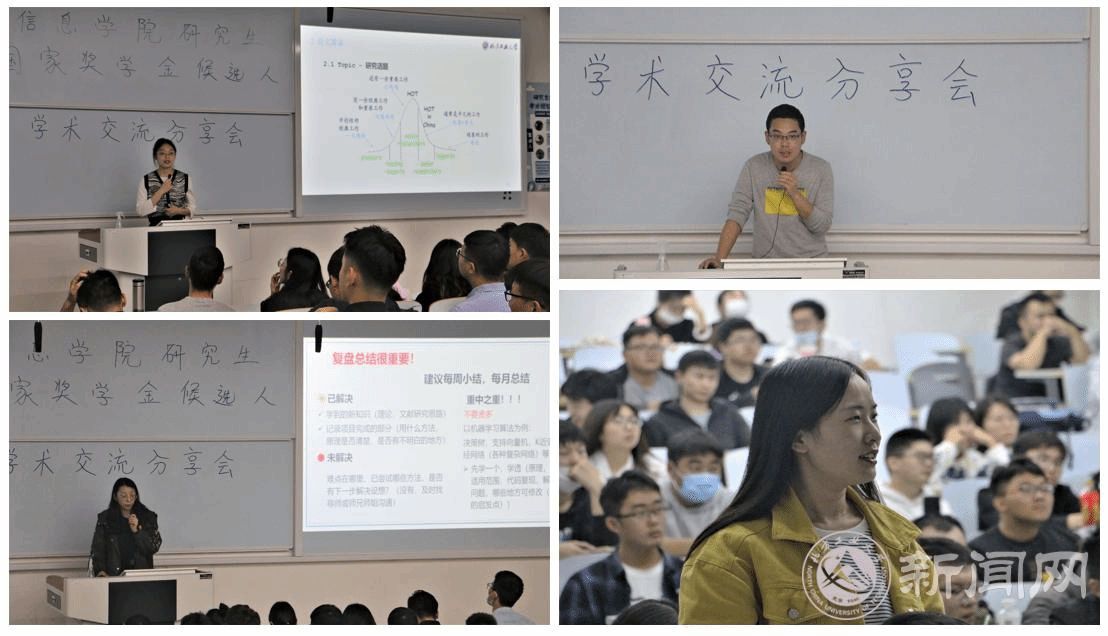 学术分享活动在瀚学楼208教室举办,国奖得主为新生分享了学习研究的宝贵经验。单一平从研究生生涯规划角度,强调做好学业计划的重要性,建议大家明确阶段性目标,罗列清单,定期复盘,查漏补缺,持续精进。杨哲从学科竞赛的创新选题、团队组建和项目申报等方面,阐述了独特的竞赛理念。葛亚坤分享了论文发表的经验,从论文选题到文献筛选,再到论文撰写和期刊投稿,环环相扣,细致入微。同学们纷纷表示学长学姐的分享干货满满,受益匪浅。