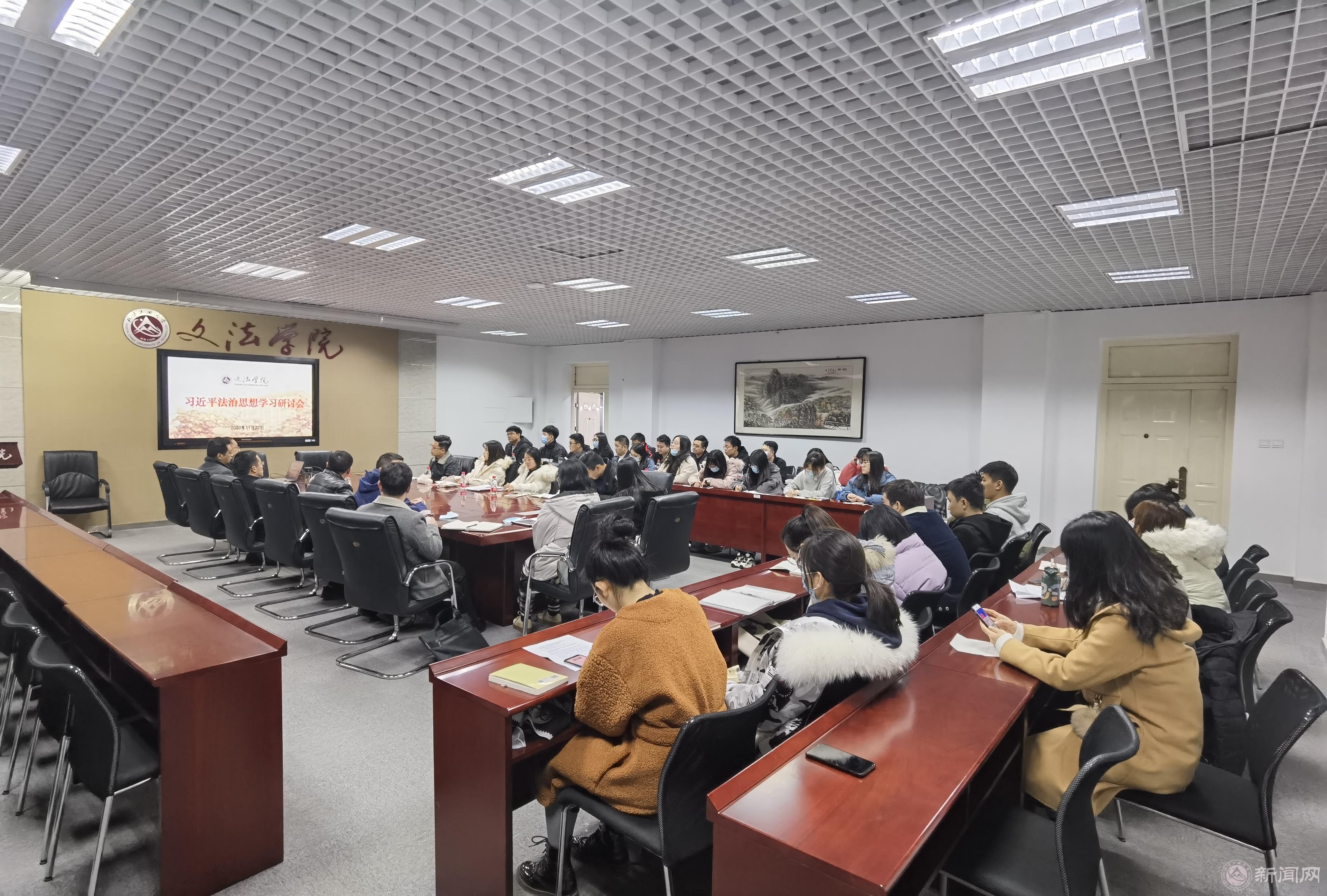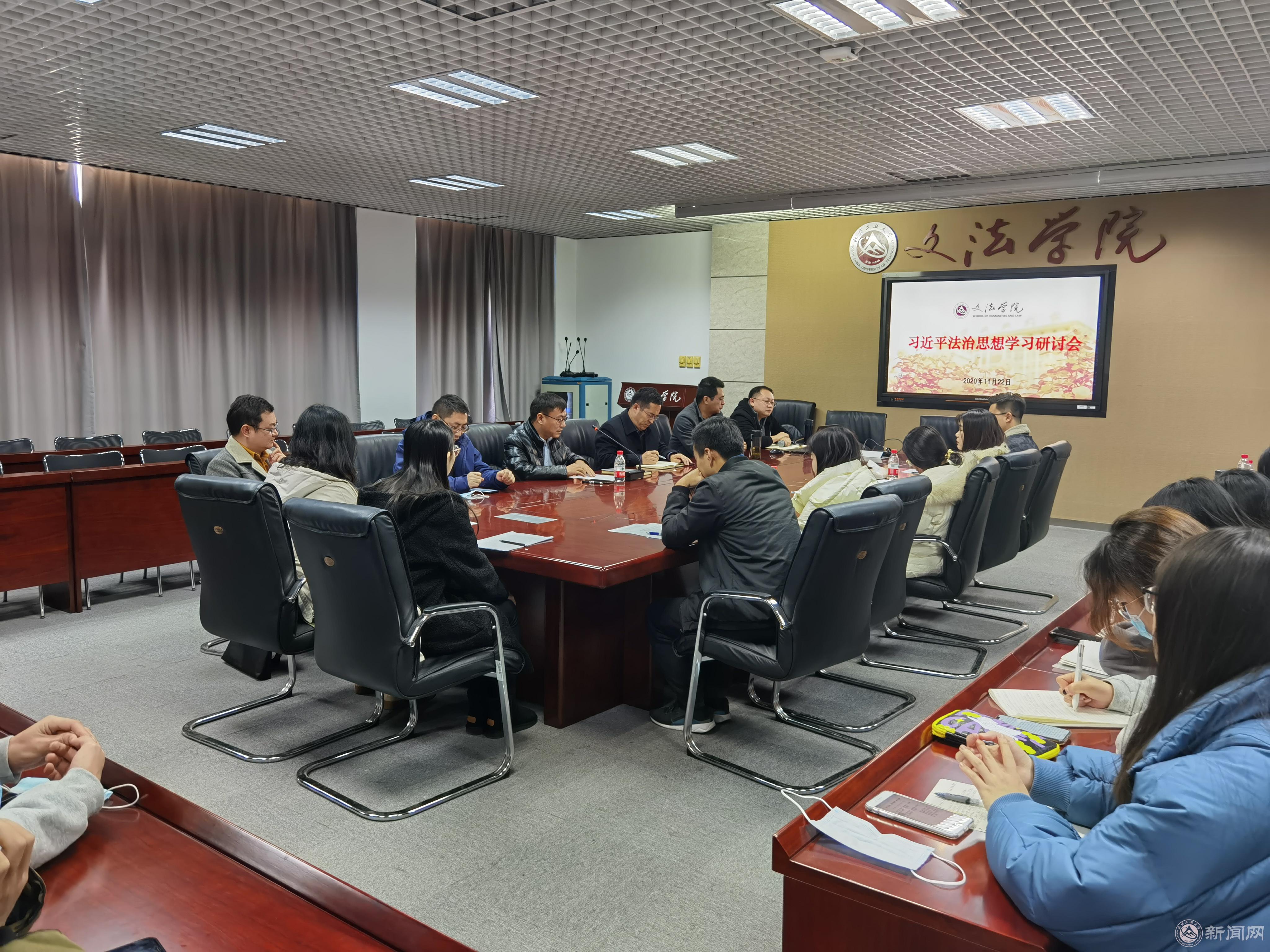 11月22日下午,永利官网文法学院师生在瀚学楼710召开习近平法治思想学习研讨会,学院副院长袁凤识、副书记刘祥坠及部分师生代表共40余人参加了学习研讨。