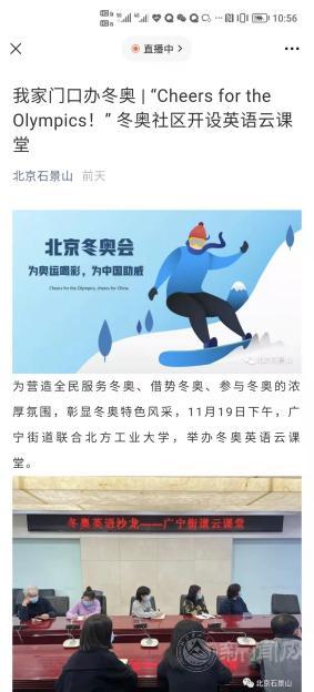 为营造服务冬奥、参与冬奥的浓厚氛围,弘扬志愿服务精神,彰显冬奥特色风采,11月19日下午,信息学院联合广宁街道举办“冬奥英语云课堂”线上冬奥英语普及活动。本次活动受到了北京石景山、腾飞广宁等微信平台和石景山新闻的报道。
