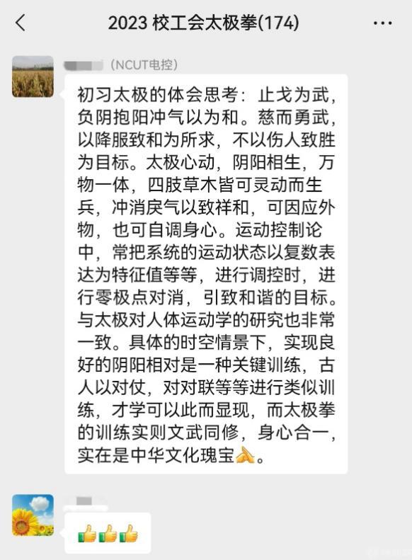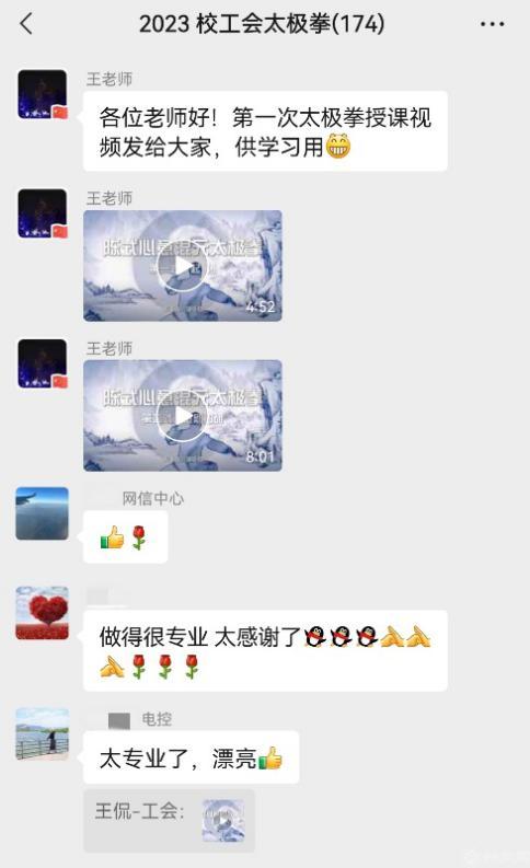 为方便教学组织与管理,校工会组建了太极拳培训微信群,定期分享分解动作视频供广大教职工课后练习。在群内大家除了可以接收上课通知,还能交流学习心得。教职工们纷纷表示,此次活动安排周密、服务细致,太极拳教学内容难度适中,不仅锻炼了身体,更让大家领略到太极拳作为中华民族文化瑰宝的独特魅力。
