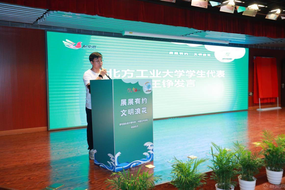 活动中,王铮作为高校学生代表进行发言:“我们将继续发挥专业优势,打造思政VR课堂,依托“展展有约 文明浪花”活动平台,积极参与社区文明实践活动,真正做到了走出校门,走进基层,了解社会、服务人民群众、增强时代责任。”