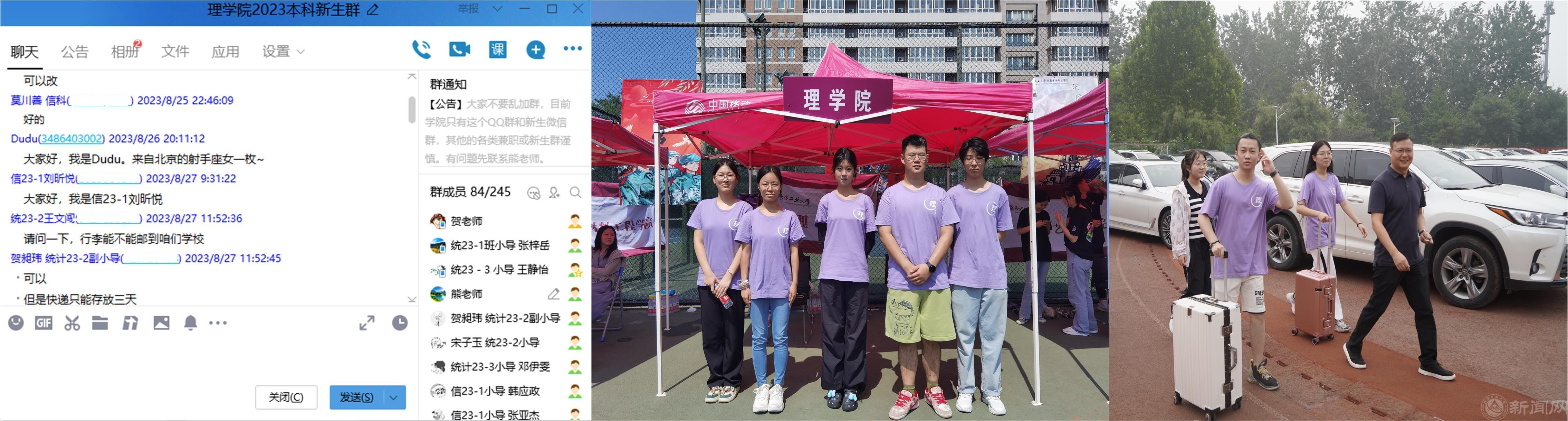 早在7月,学院就创建了“理学院2023级本科新生群”QQ群,方便新生咨询。9月3日至4日,学院在小操场搭好帐篷、准备好小推车为提前入校放置行李的新生提供服务。