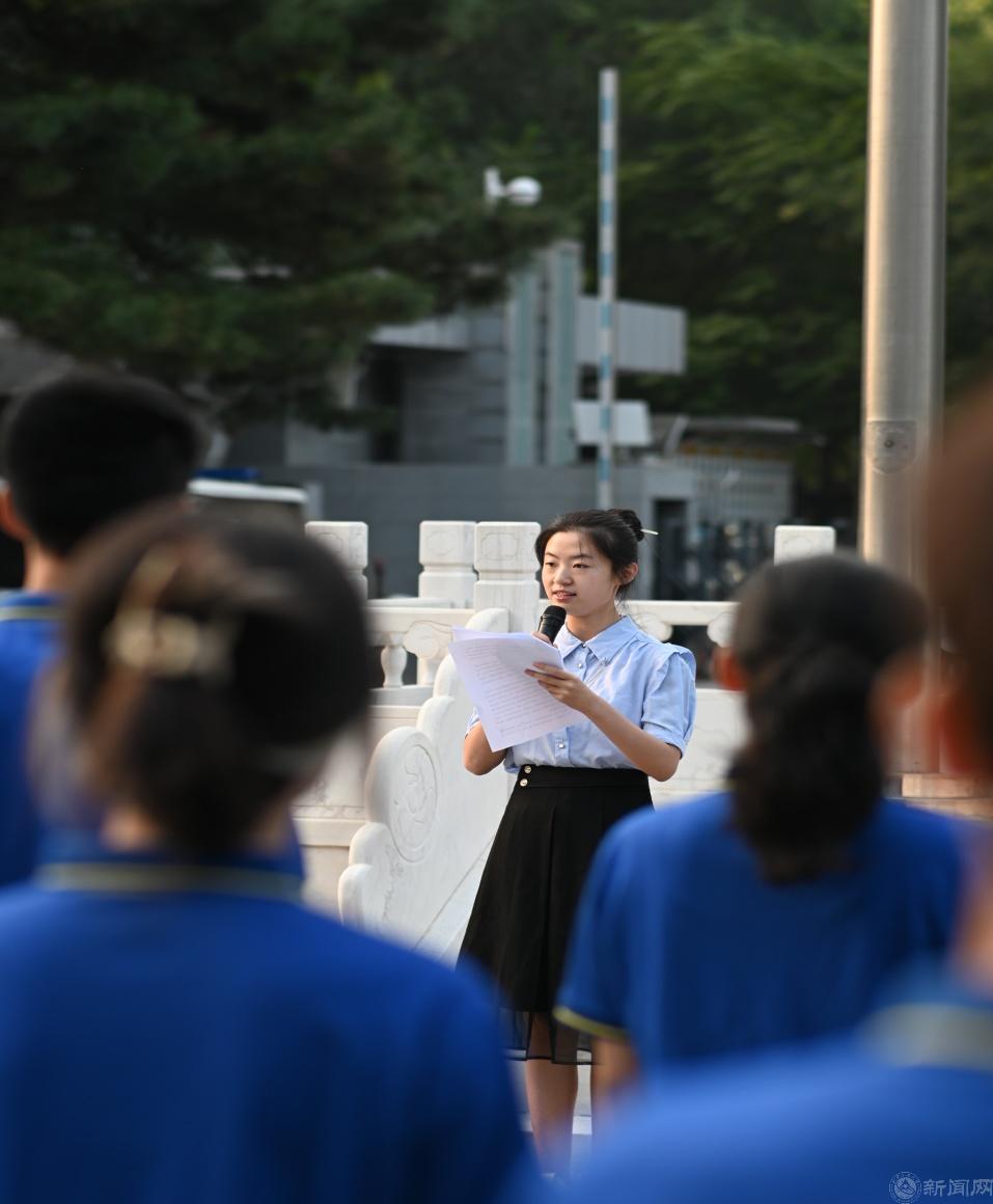 “升国旗、奏唱国歌”。国旗班的升旗、护旗和仪仗队方阵的队员们目光坚毅,踏着坚定的步伐、整齐划一地护卫着鲜红的国旗迈向升旗台。全场师生庄严站立在敦品楼前广场,深情注目着鲜红的五星红旗冉冉升起,齐声高唱国歌!“历史不能忘,吾辈当自强!”这一波澜壮阔的豪迈宣言在心中萦绕!