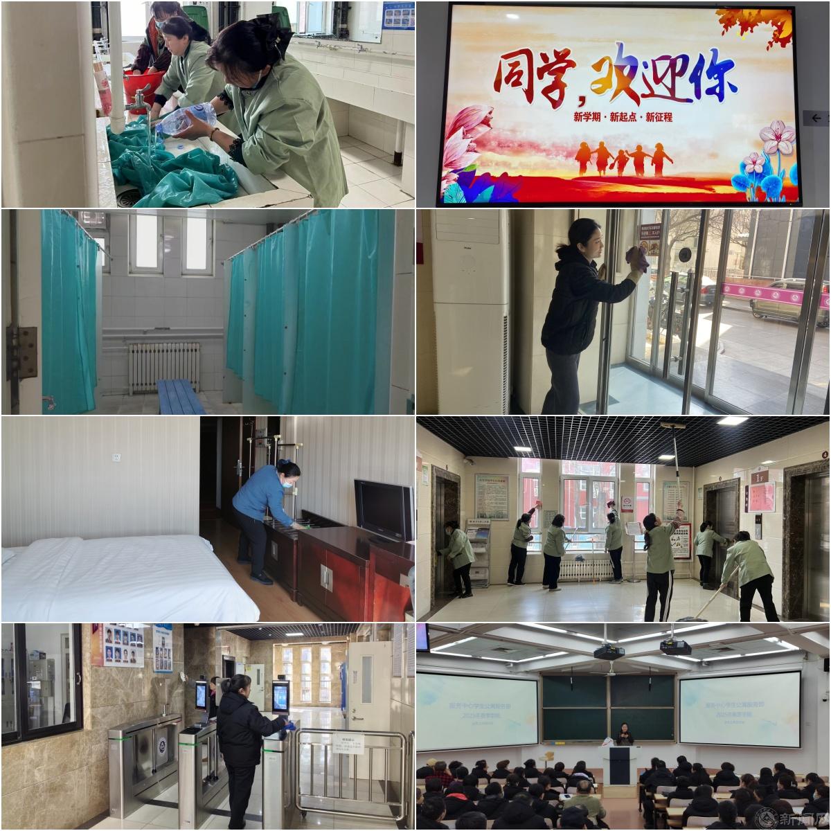 学生公寓服务部利用电视显示屏欢迎同学们“回家”,提升返校体验;每日多次进行宿舍内外巡视,排除楼内外安全隐患,让同学们放心入住;清洁大厅公共区域设备设施,干净明亮的迎接同学们“回家”;清洗浴室浴帘,让浴室焕然一新,给同学们一个干净卫生的浴室环境;组织保洁人员对公寓内部的各个角落进行深度清洁,确保卫生无死角;组织部门全体员工开展新学期上岗培训,提升服务态度,为学生营造温馨舒适的居住环境。