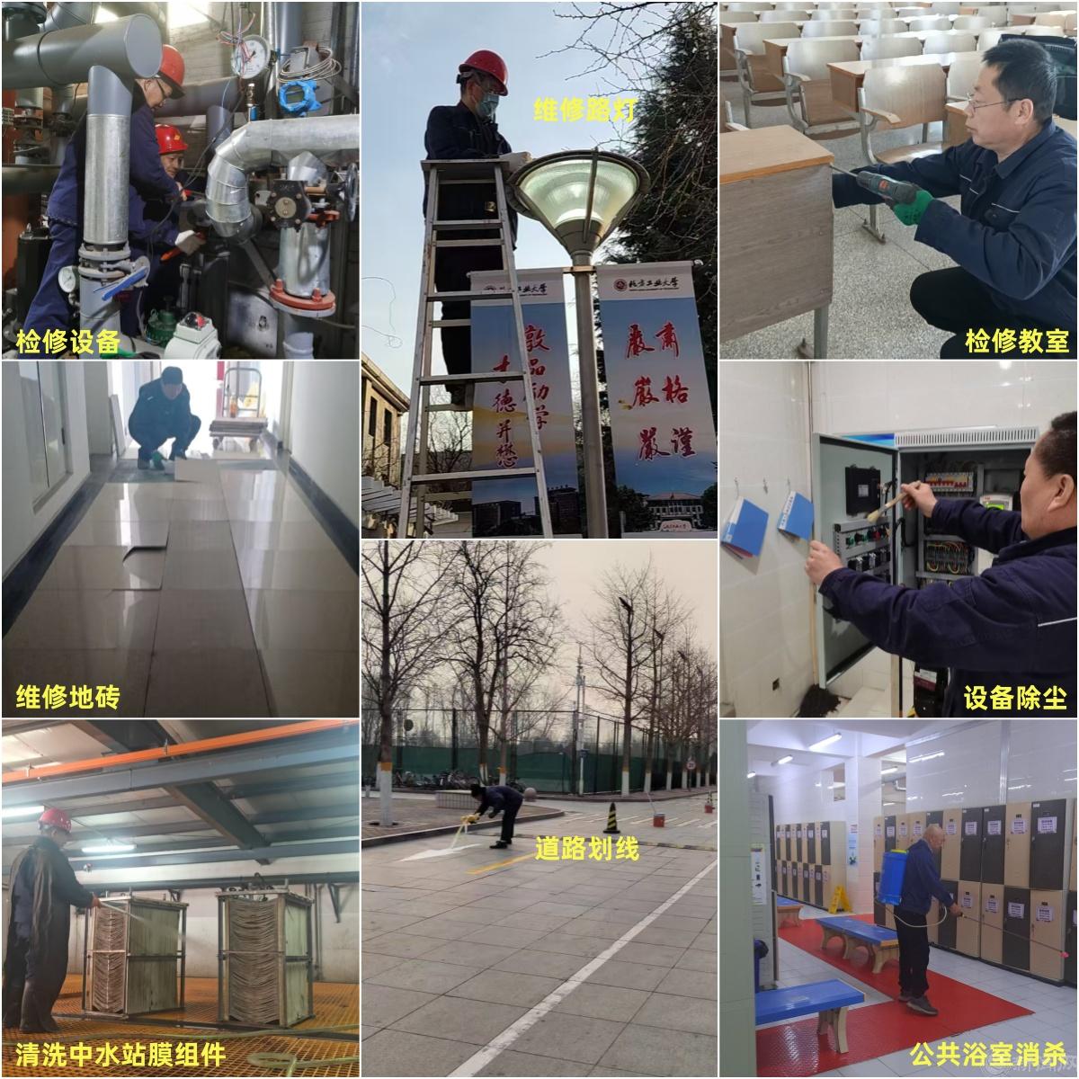 报修项目及时处理, 对学生公寓、教学楼宇及公共区域各项报修内容进行全面梳理,查漏补缺,及时修复;设施设备全面巡检,对水电气设施设备,以及校园路灯、楼宇强电间、中水站等进行了全面巡检,发现问题立即处理。