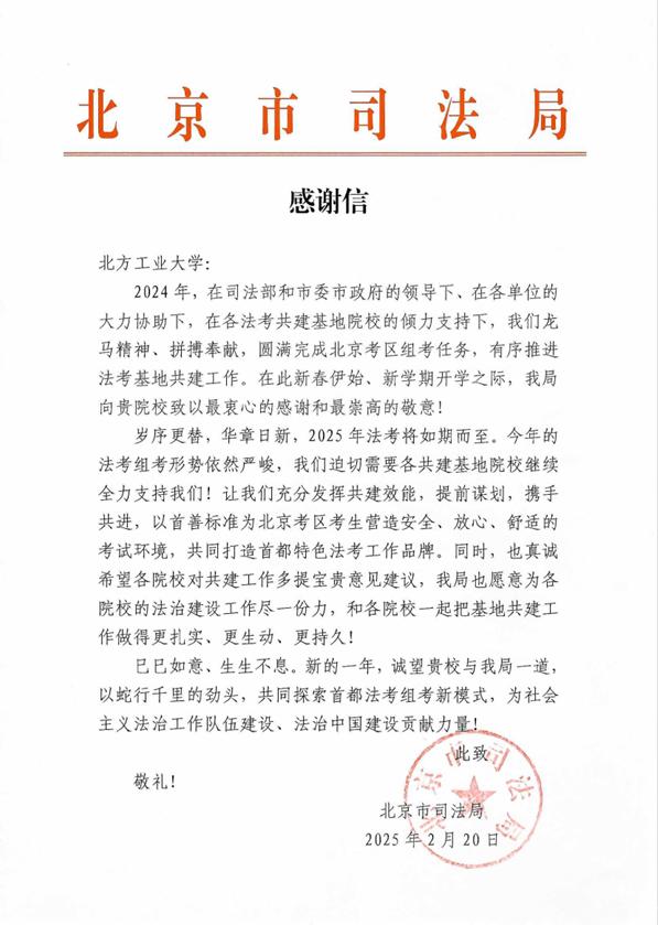 近日,北京市司法局向永利官网发来感谢信,对永利官网在国家统一法律职业资格考试北京考区组考工作中作出的重要贡献给予高度评价,并致以新春祝福与表达深化合作愿景。