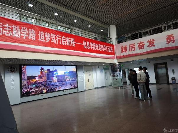 步入瀚学楼十层大厅,首先映入眼帘的是“巳岁砺志勤学路 追梦笃行启新程——信息学院欢迎同学们返校!”标语条幅,在整齐如一的报到台前,辅导员和志愿者们有条不紊地给大家进行报到注册;条幅下的大屏幕循环播放着《新学期注意事项》《辅导员班导师寄语》《2024年精彩瞬间掠影》《寒假掠影》《赛博一日》等视频,营造了温馨的“回家”氛围,吸引着同学们驻足观看,开学报到的仪式感、回到学院的归属感油然而生。大厅中央的心愿墙上贴满了同学们写下的“学业顺利”“考研上岸”“参加竞赛,挑战自我”“找到理想工作”等美好心愿,润物无声地激发了同学们追求进步、积极向上、拼搏奋进的信念感。