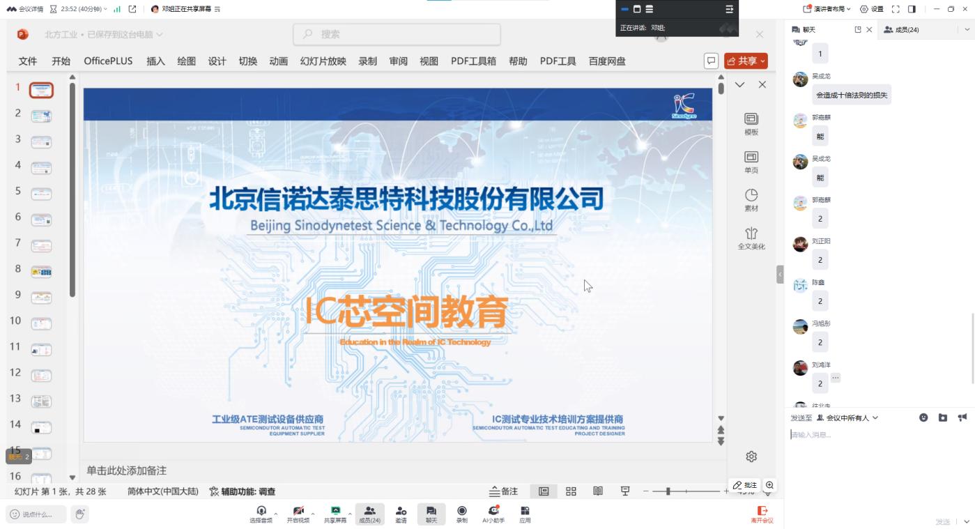 此外,北京信诺达科技有限公司邓亚芬、集成电路学院系主任魏淑华、辅导员王鑫淼以及学院学生通过线上形式进行互动交流。邓亚芬老师通过问答形式向参会学生介绍信诺达科技有限公司在芯片设计、集成电路测试等领域的技术优势,并详细讲解“信诺达杯”的竞赛背景及参赛所需的关键能力。还对参会学生提供一对一简历辅导,分享就业、面试技巧。邓亚芬老师以丰富的行业经验和深刻见解,鼓励学生积极参与专业赛事,提升自身的专业能力和团队协作力,为未来职业发展奠定坚实基础。