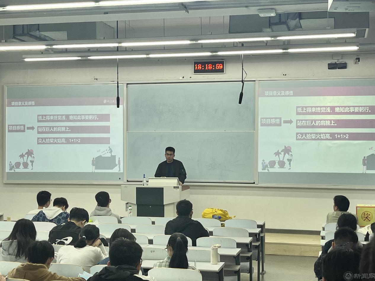 会上,张恩鑫、郭竞天分别以"运算放大器的芯片设计验证与测试"、"数智域言"为案例,深入浅出地讲解项目开发过程中的关键环节,通过流程图展示、代码片段解析和相关视频播放等多种形式,让在场同学对项目开发有更加直观的认识。为增强学生活动参与感,本次分享会采用"讲座+互动+抽奖"的多元形式,引导同学们主动思考与学习。互动抽奖活动使现场气氛热烈,同学们积极参与、收获颇丰。
