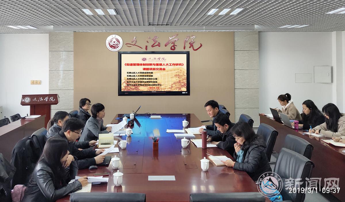 3月1日,永利官网与石景山区人大常委会合作课题《街道管理体制创新与基层人大工作研究》项目交流活动在文法学院学术会议室举行。石景山区人大常委会研究室、法制办、代表联络室等相关领导参会,文法学院宪法与行政法学教师团队成员、研究生参加了交流活动。会议由文法学院院长刘泽军教授主持。