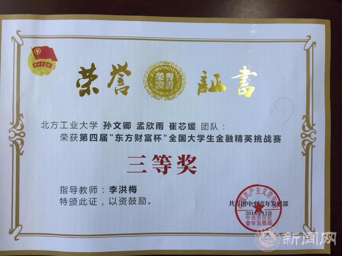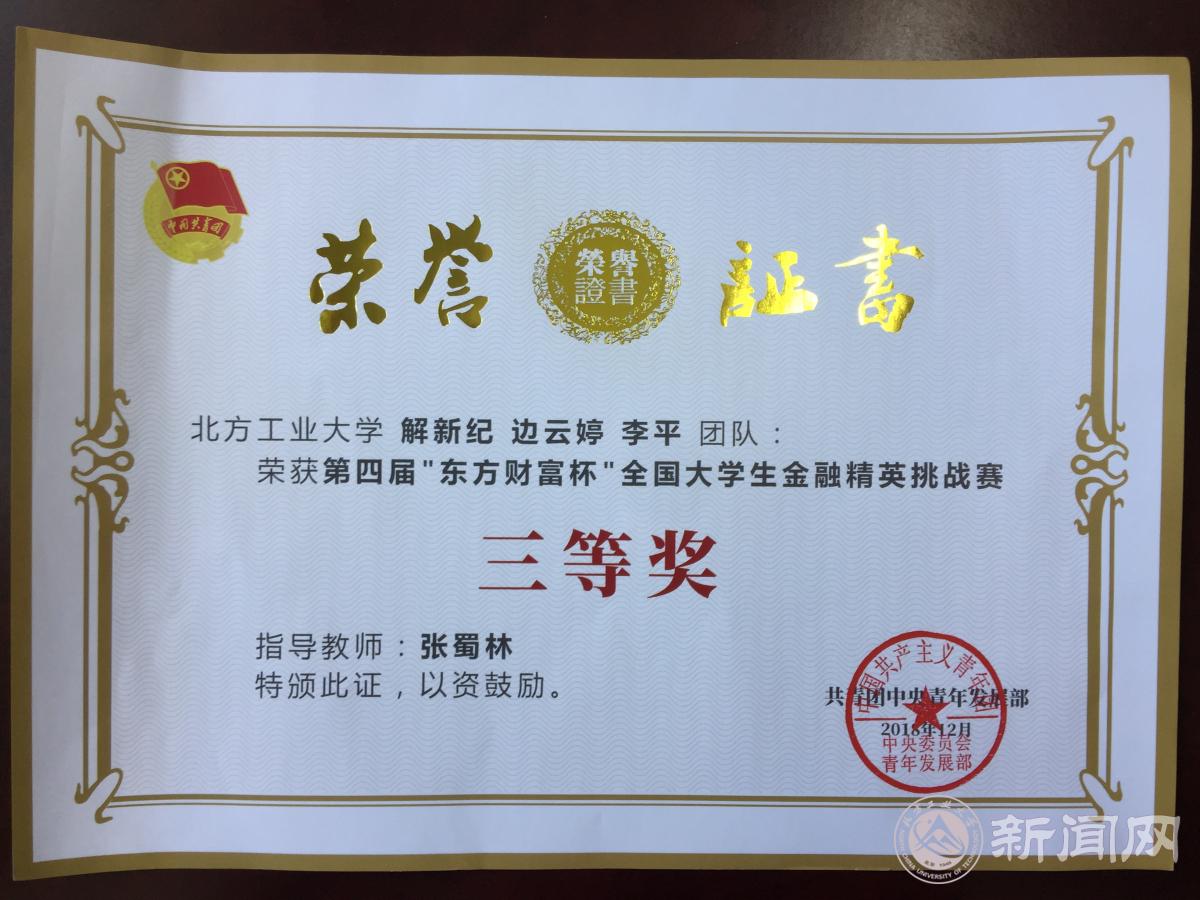 由共青团中央青年发展部主办,东方财富信息股份有限公司、全国学校共青团研究中心承办的第四届“东方财富杯”全国大学生金融精英挑战赛圆满结束。永利官网经管学院经济系张蜀林老师、李洪梅老师作为指导教师,组织2016级经济与金融专业学生全员参加了本届大赛,最终有5支团队、共15名学生,分别获取本届大赛的“团体三等奖“。