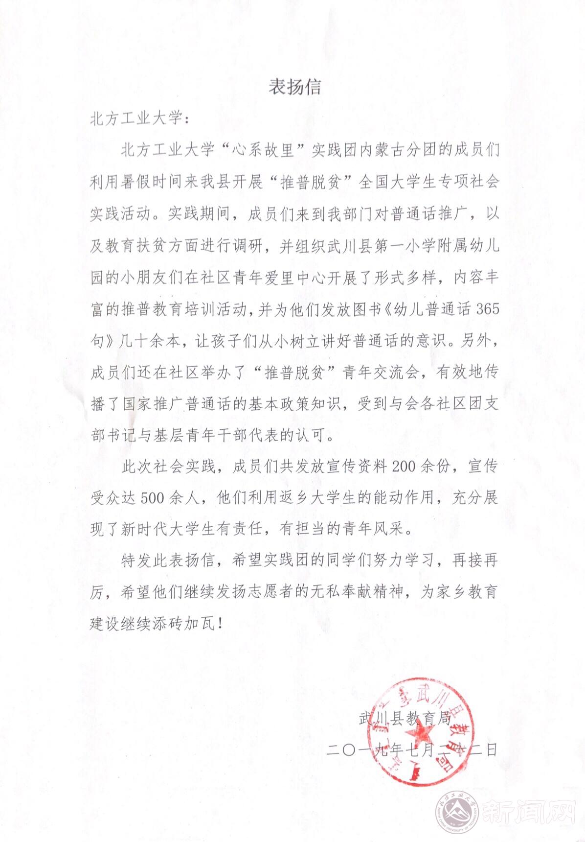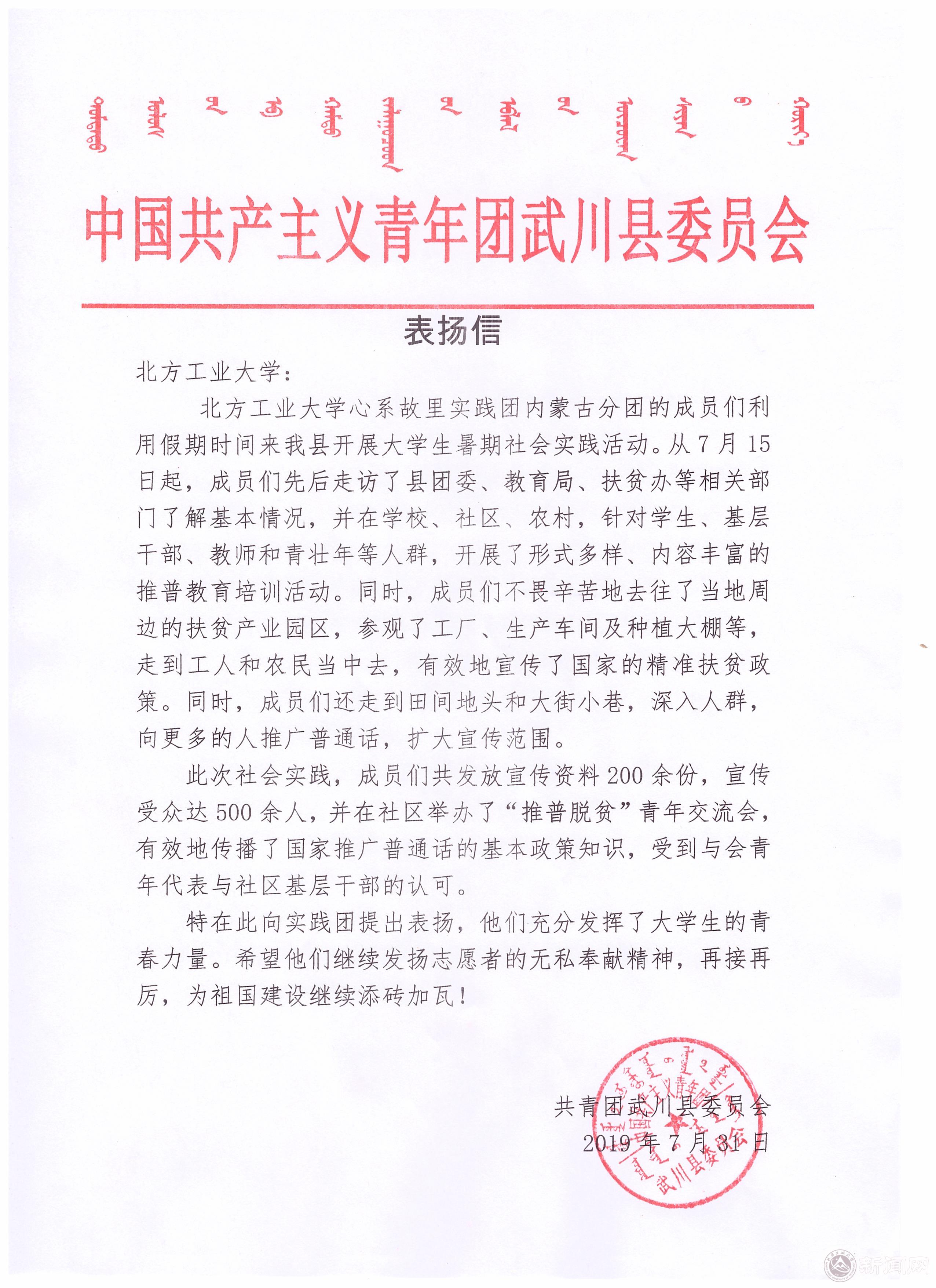 内蒙古分团受到武川县教育局、团县委表扬