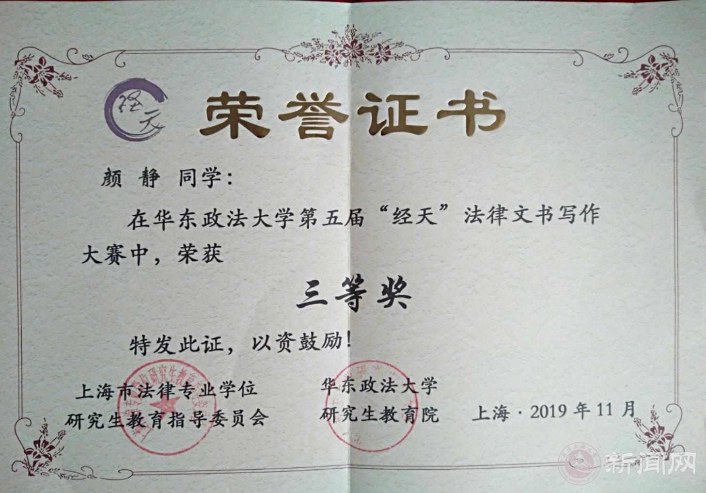 永利官网2019级法律硕士研究生颜静在第五届“经天杯”法律文书竞赛中,充分展现法学学子的精神风貌和专业素养,过关斩将,从599位选手中脱颖而出,跻身前六强,荣获三等奖。