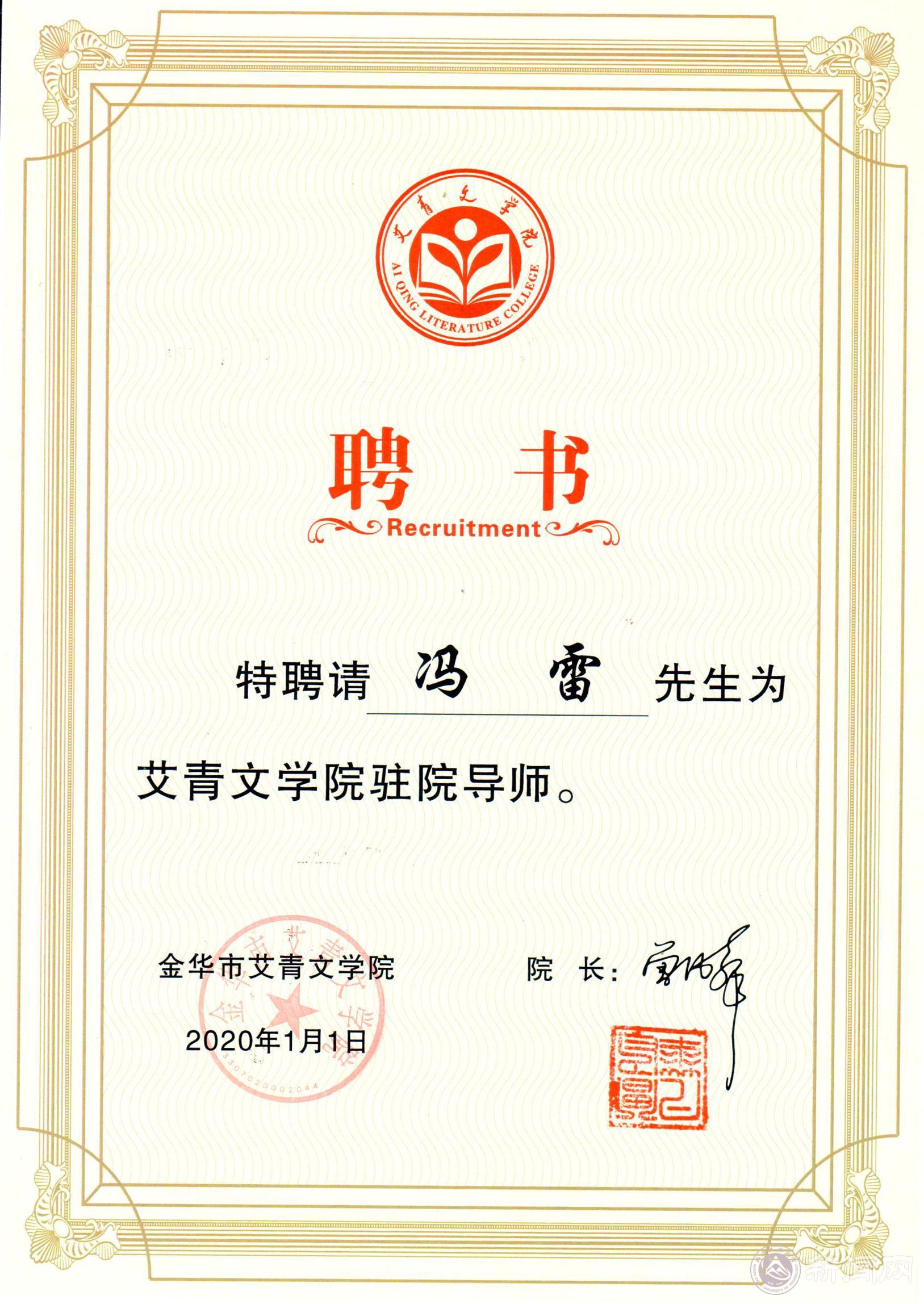 近日,永利官网文法学院中文系教师冯雷被艾青文学院聘为驻院导师。