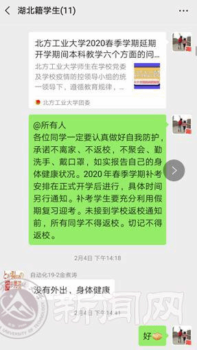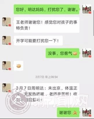 辅导员们密切关注着每名学生的朋友圈,时刻提醒学生不去人员密集的公共场所,尽量减少不必要的聚会聚餐等活动。通过在学生群和朋友圈的不间断提醒,让学生知晓和践行学校“不离家、不返校”的防控要求。大家还从“学生辅导员”变身“防疫咨询热线”,电控学院辅导员王磊逐一向学生及其家长发送温馨提示,得到了家长的高度赞扬,并评价为“对孩子的事特负责”。文法学院辅导员尤博在自己的微信圈里“以身作则”,通过晒图的方式引导学生们在家里“多读书、多写作、多锻炼”。