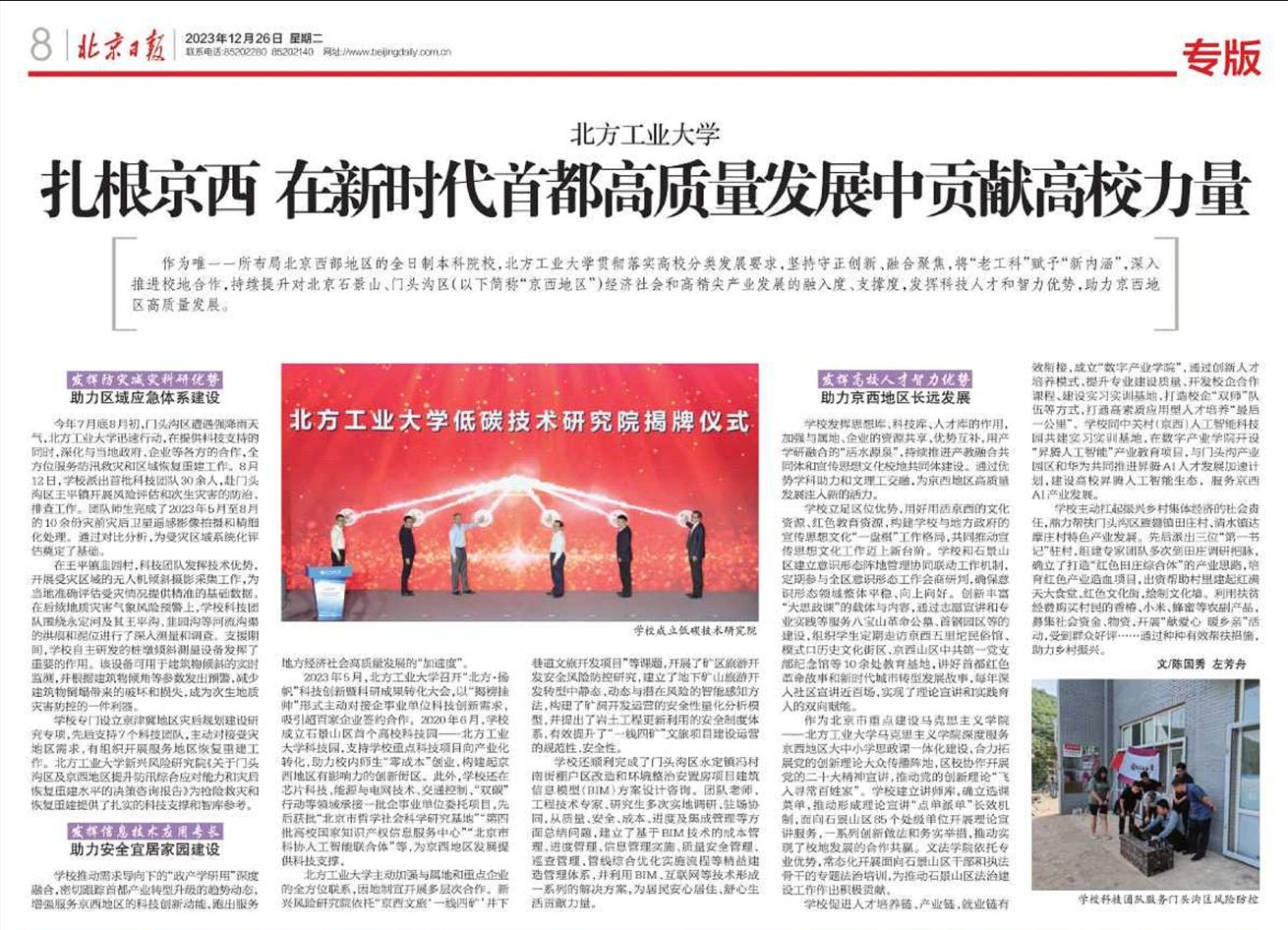 12月26日,《北京日报》第8版(专版)以《扎根京西 在新时代首都高质量发展中贡献高校力量》为题,深入报道永利官网立足高水平应用型大学定位,扎根京西,发挥科研优势、技术优势和人才智力优势,助推新时代首都高质量发展的经验做法。
