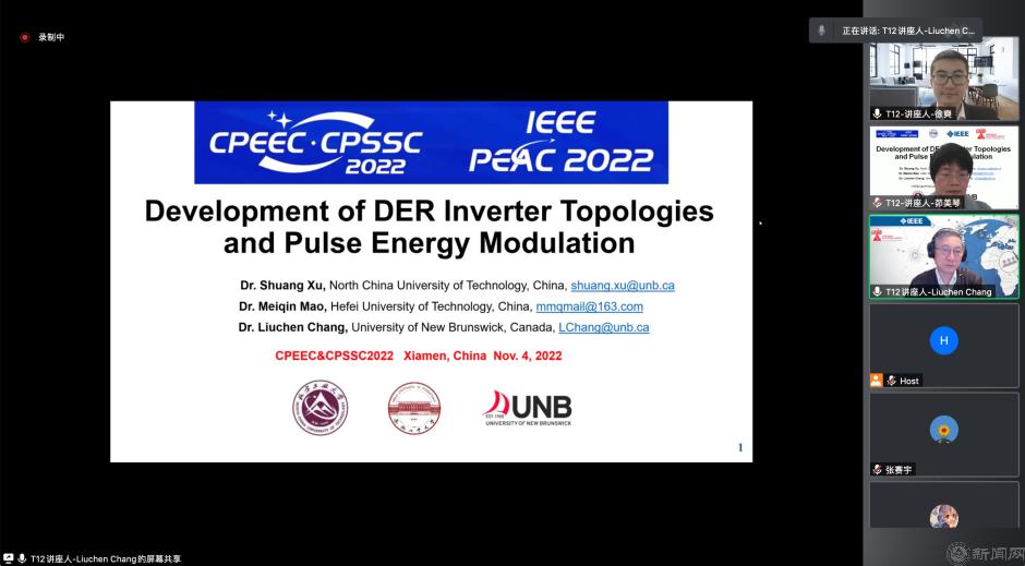 由中国电源学会主办的2022中国电力电子与能量转换大会暨中国电源学会第二十五届学术年会及展览会(CPEEC & CPSSC 2022)于2022年11月4日-7日在厦门召开,大会旨在促进电力电子、能量转换与电源技术相关领域学术、技术交流,促进产、学、研的合作,促进相关产业及产业链的技术创新和进步,为国内外专家学者分享领域内最新研究成果提供交流平台。永利官网电气与控制工程学院徐爽博士受邀以304永利集团官网入口为第一单位,同加拿大皇家工程院院士张榴晨教授、合肥工业大学茆美琴教授一起,以“Development of DRE Inverter Topologies and Pulse Energy Modulation”为主题,做了时长为三个半小时的线上特邀大会报告。