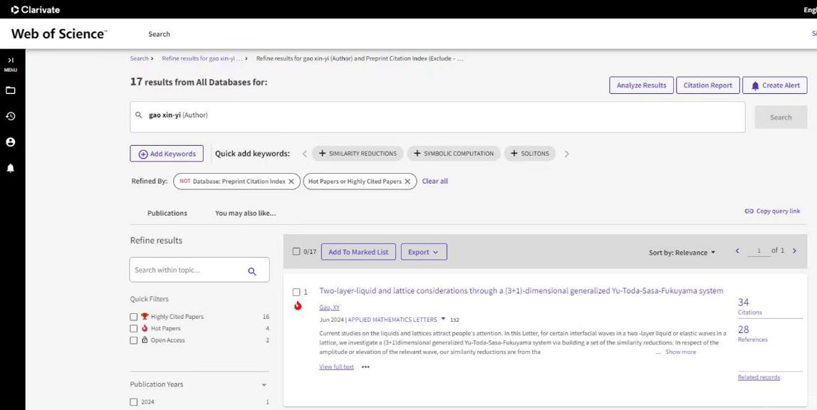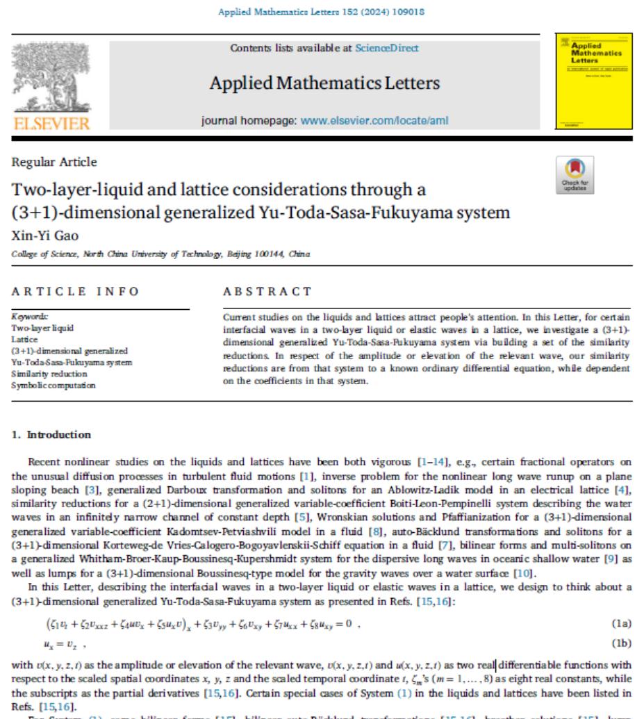 近日,永利官网理学院教师高心怡在Applied Mathematics Letters(应用数学快报)发表的标题为Two-layer-liquid and lattice considerations through a (3+1)-dimensional generalized Yu-Toda-Sasa-Fukuyama system[通过(3+1)维广义Yu-Toda-Sasa-Fukuyama系统考察双层液体和晶格]的文章入选“ESI热点论文”。