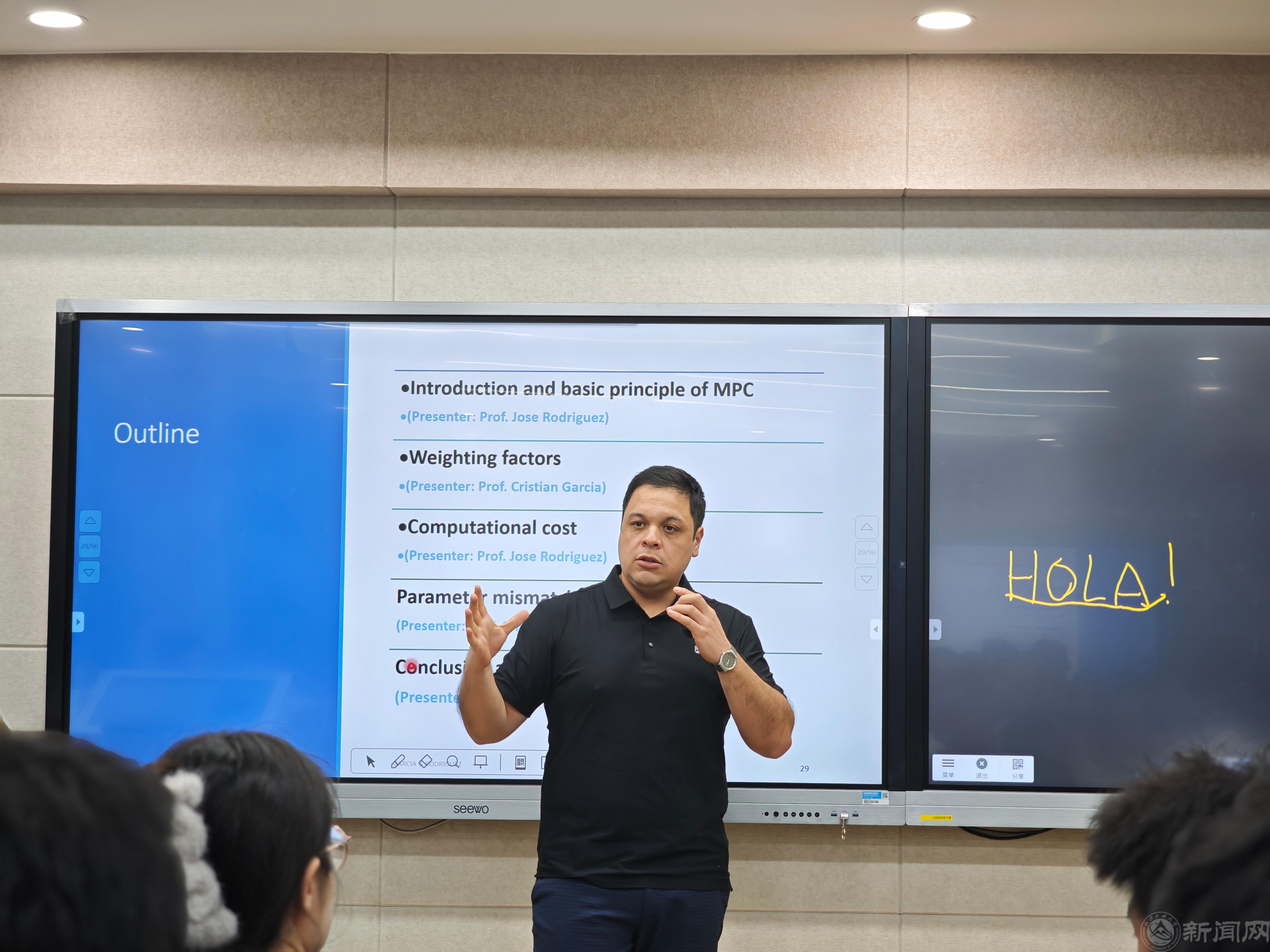 随后,题为“Predictive Control in Power Electronics: Latest Advances, Applications and Challenges”的学术讲座在博远楼会议室隆重举行。在报告中,Rodriguez教授和Garcia教授系统梳理了模型预测控制(MPC)技术自诞生以来的发展脉络。他们首先阐述了MPC的核心概念与基本原理,强调了其概念简洁、能灵活融入多控制目标以及动态性能优越等显著优势。同时,他们也坦诚讨论了MPC早期面临的挑战,如对数学模型和参数的依赖性以及开关频率变化等问题,并介绍了国际学术界如何通过持续研究,成功克服了其中大部分难题。