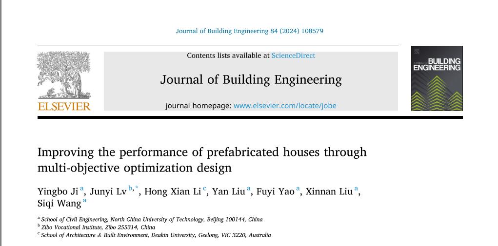 近期,永利官网土木工程学院纪颖波教授团队在建筑技术领域的顶级学术期刊《Journal of Building Engineering》上发表论文“Improving the performance of prefabricated houses through multi-objective optimization design”。该期刊为SCI检索期刊,JCR分区一区,近五年平均影响因子6.5,中科院工程技术2区Top。永利官网纪颖波教授为第一作者,2019级硕士生吕君毅为第二作者,合作者包括澳大利亚迪肯大学李红仙副教授(第三作者)、永利官网刘妍、姚福义、刘心男老师和硕士生王思琪为论文共同作者。