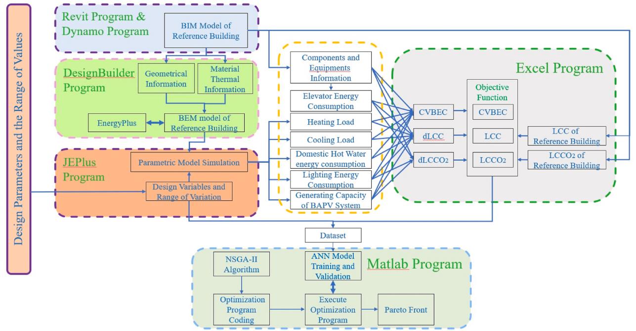 装配式建筑可持续性是其建设性能考量的重要指标,其优化设计需综合考虑能源效率、经济性、环境影响等多个方面,如何科学、合理地选择装配式围护结构、建筑朝向和光伏系统等生产设计要素是需要重点解决的难题。该论文提出了一种可实现最大限度地减少建筑能耗、成本和碳排放的多目标优化框架,主要包括:使用BIM模型、DesignBuilder和JEPlus以及开发的Excel程序模拟设计解决方案的能源性能;利用人工神经网络和NSGA-II算法对建筑综合能耗(CVBEC)、全寿命成本(LCC)和全寿命碳排放(LCCO2)进行多目标优化,得到Pareto最优解。研究结果证实了优化框架的有效性,为我国装配式建筑在新建建筑及城市更新活动中节能策略选择提供了分析工具。
