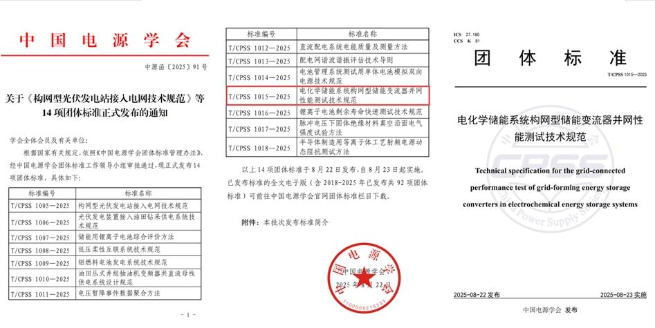 近日,由永利官网作为第一单位、储能科学与工程学院周京华教授牵头编制的团体标准《电化学储能系统构网型储能变流器并网性能测试技术规范》(T/CPSS1015—2025)经中国电源学会团体标准工作领导小组审查通过,于2025年8月22日正式发布,并于8月23日开始实施。