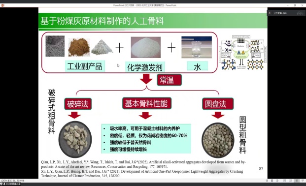 10月10日下午,土木工程学院邀请香港理工大学戴建国教授以线上方式为学院师生做了题为“新型土木工程材料和结构研究进展”的学术报告。学院部分教师和研究生参加会议。报告会由学院副院长宋小软教授主持。戴建国教授通过“多功能混凝土/钢结构表面涂层”“超高性能纤维增强水泥基复合材料”“纤维增强树脂复合材料及结构”“化学激发地聚物水泥/混凝土”“基于粉煤灰原材料制作的人工骨料”五个部分进行了深入讲解。报告开阔了...